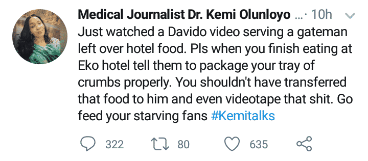 Controversial and self styled Nigerian investigative journalist, Kemi Olunloyo has alleged Davido fed his gateman with leftover food.