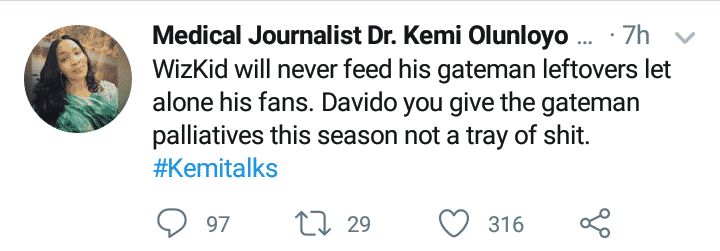 Kemi also said that she knows Wizkid cannot feed his gateman with leftover food not to talk of his fans.
