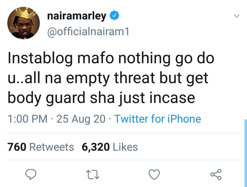 “Instablog mafo nothing go do u..all na empty threat but get body guard sha just incase”, he wrote.